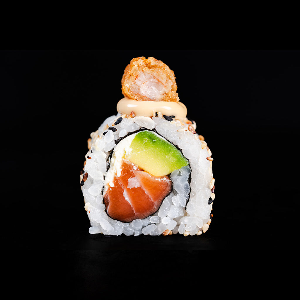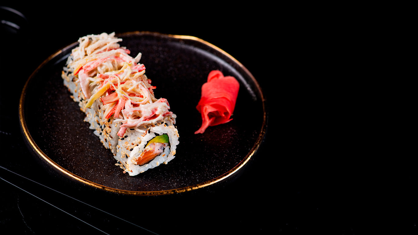 Uramaki: fusión con arroz por fuera y nori dentro, decorado con semillas y toppings para un look contemporáneo.